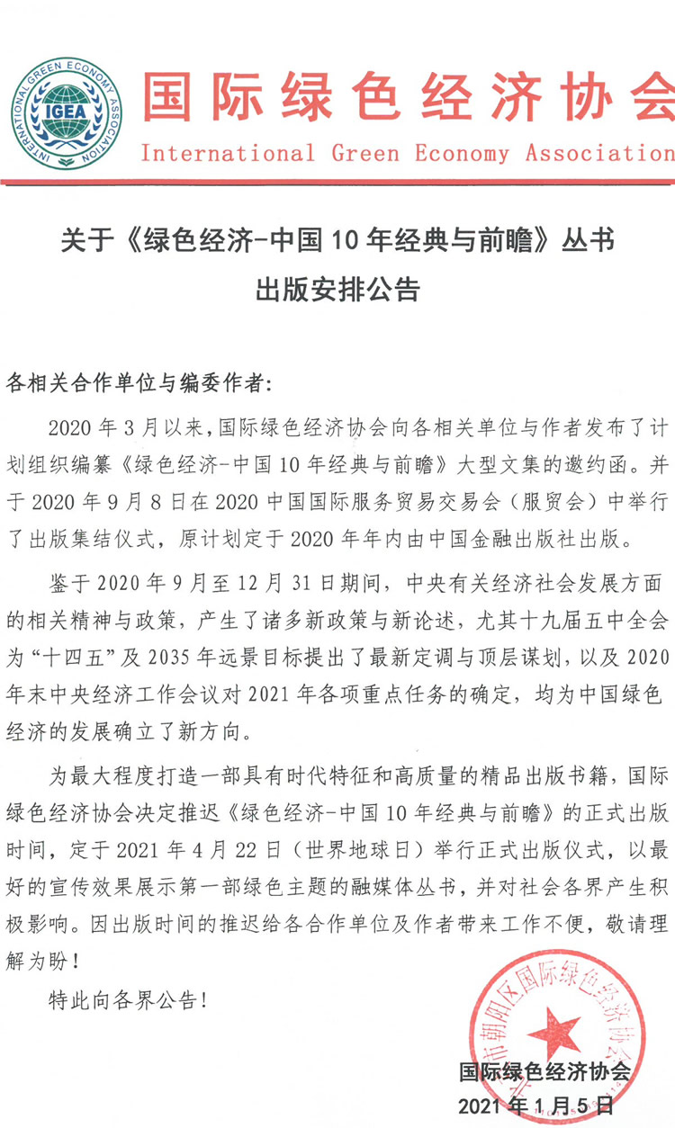 关于《绿色经济 - 中国10年经典与前瞻》丛书出版安排公告