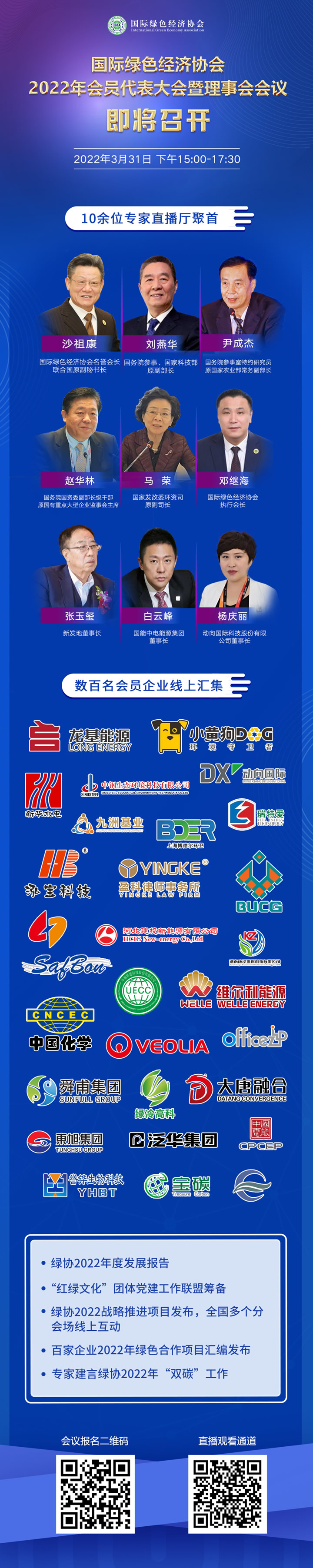 作为国内绿色发展最具代表性的社会组织,国际绿色经济协会2022年会员代表大会将于3月31日下午在线上召开。发布年度绿色经济重点工作与绿色推进项目,20名嘉宾将聚首线下直播厅,在线与数百名行业代表共同交流2022年“双碳”行动与绿色发展。